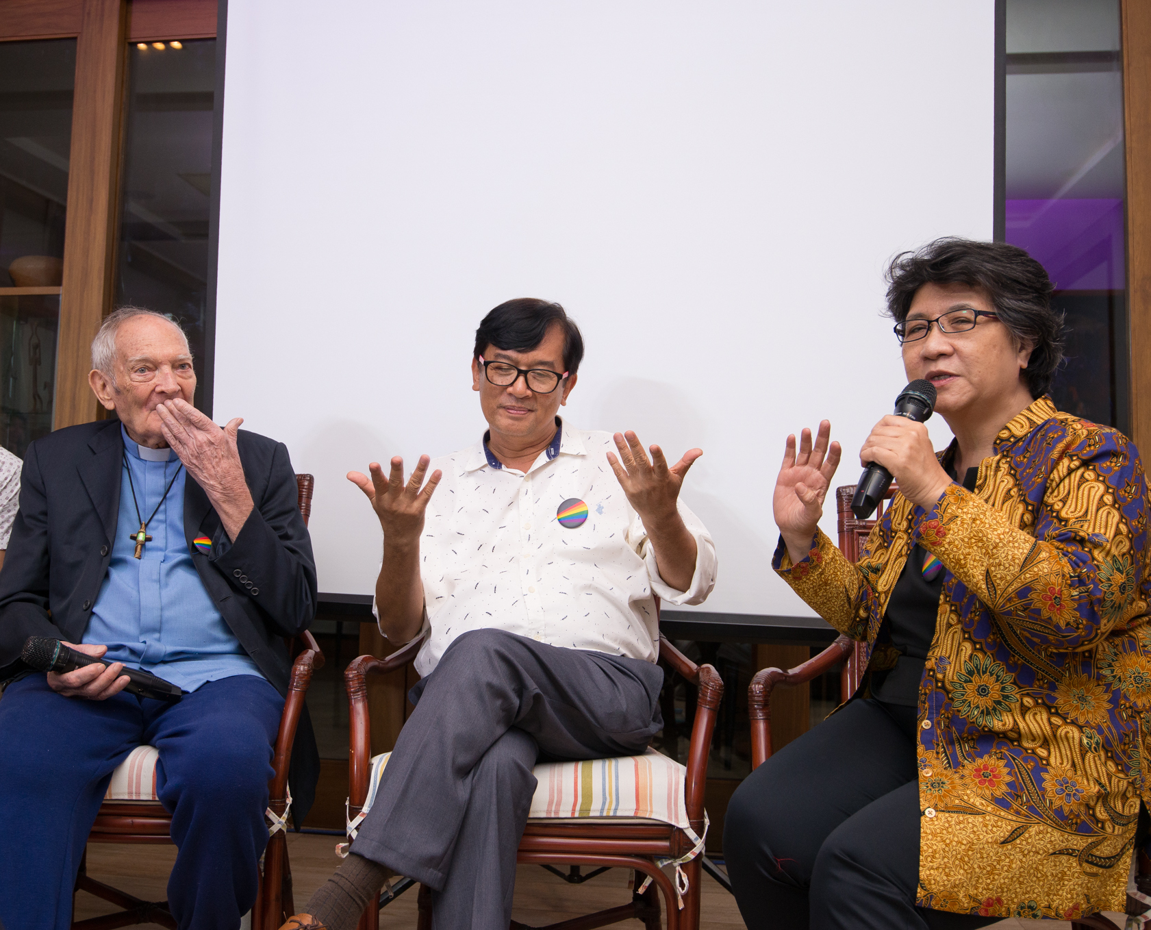 Luminaries of the Philippine LGBT advocacy: (L-R) Fr. Richard Mickley, Nick Deocampo, and Anna Leah Sarabia. Taken during the “Beyond Rainbows” event, in celebration of the International Day Against Homophobia, Biphobia, and Transphobia (IDAHOBIT), May 30, 2019
